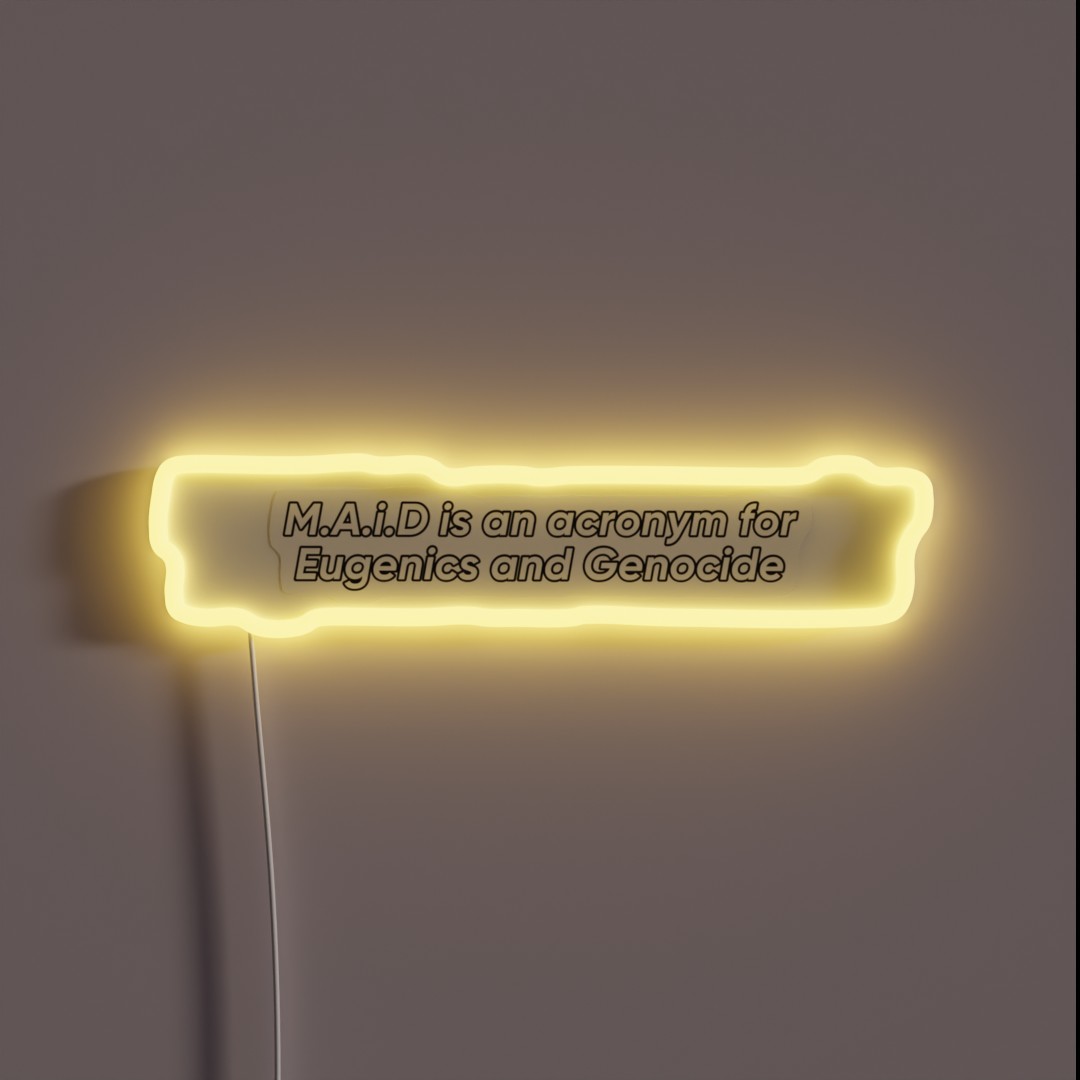Customizable, 12″ long, LED-based MAiD (Machine for Automated Instruction and Direction) themed RGB neon sign with programmable color effects and dimmer control.