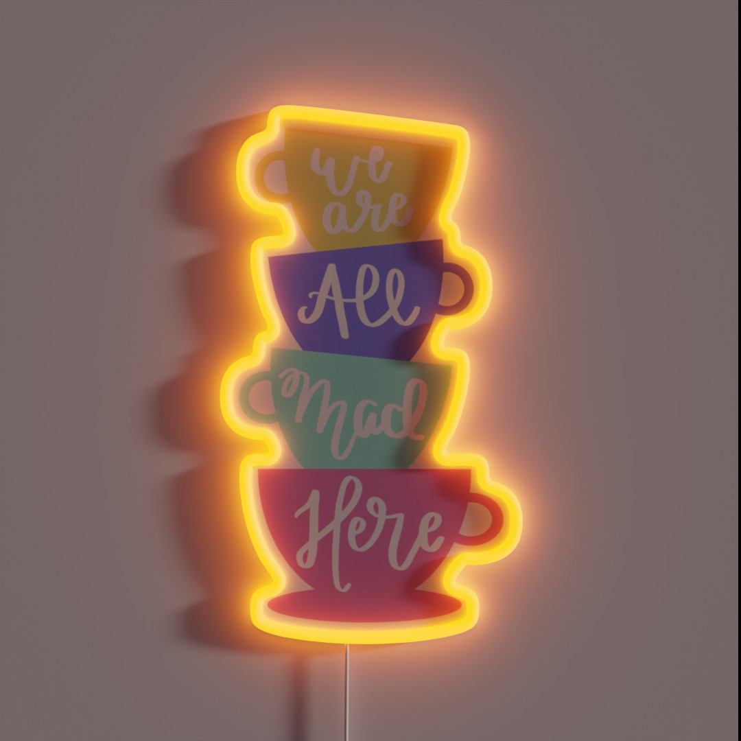 Elevate your space with the magical charm of our Mad Hatter’s Tea We Are All Mad Here RGB neon sign. Order now and join us in embracing the absurdity!