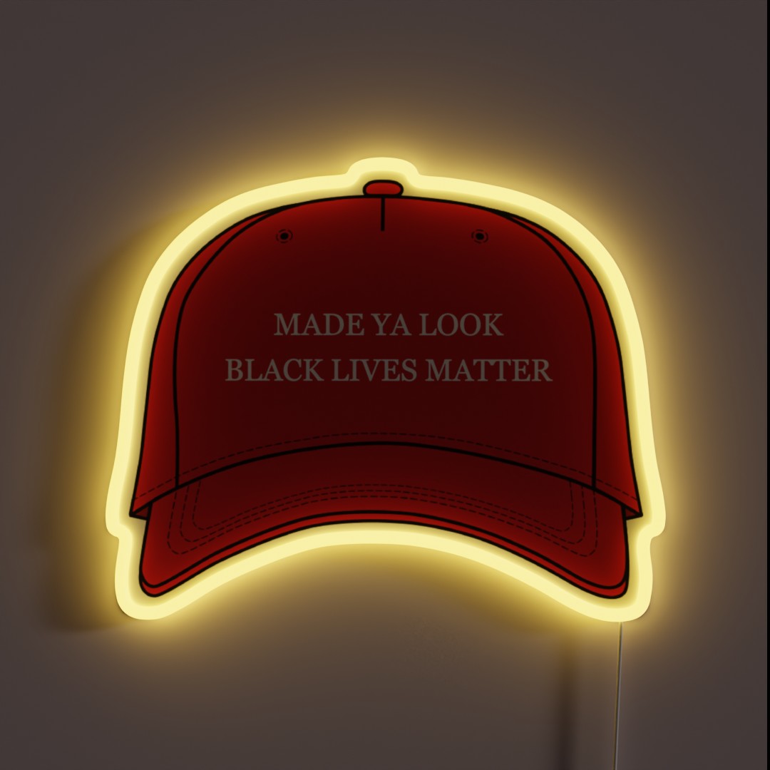 Express your solidarity with the Black Lives Matter movement in style with our vibrant MADE YA LOOK BLACK LIVES MATTER HAT RGB neon sign, featuring a bold and eye-catching design that lights up any space.