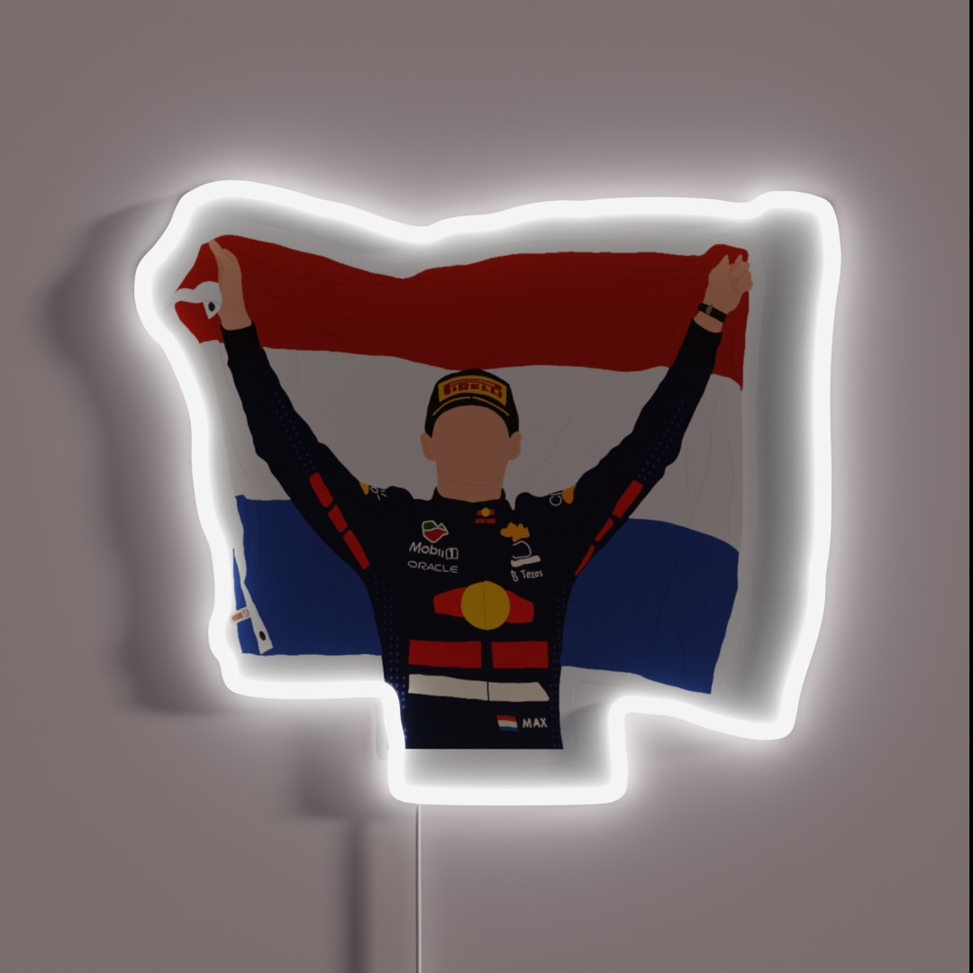 Officially licensed Max Verstappen neon sign featuring vibrant RGB colors and dynamic lighting effects, perfect for decorating any room with Red Bull Racing spirit.