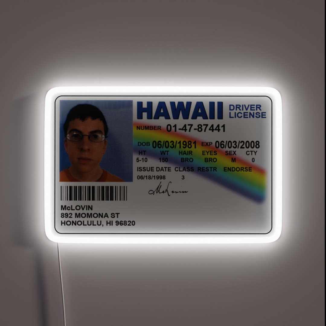 Introducing the McLovin Fake ID Funny Meme RGB Neon Sign, a hilarious and eye-catching addition to any room. This unique sign is inspired by the iconic character from the movie Superbad and features a funny meme design that’s sure to bring a smile to anyone’s face.