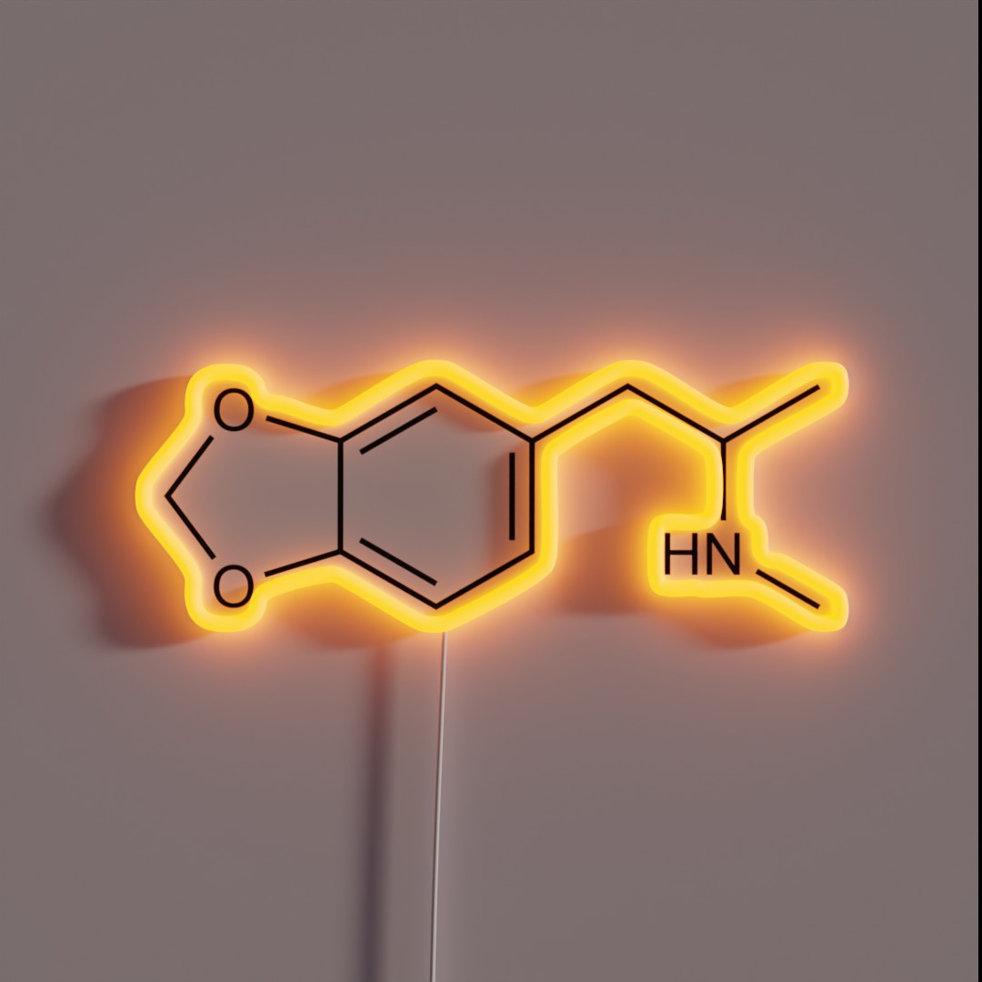Illuminated MDMA molecule structure art, a vibrant RGB neon sign featuring the chemical formula in mesmerizing colors.