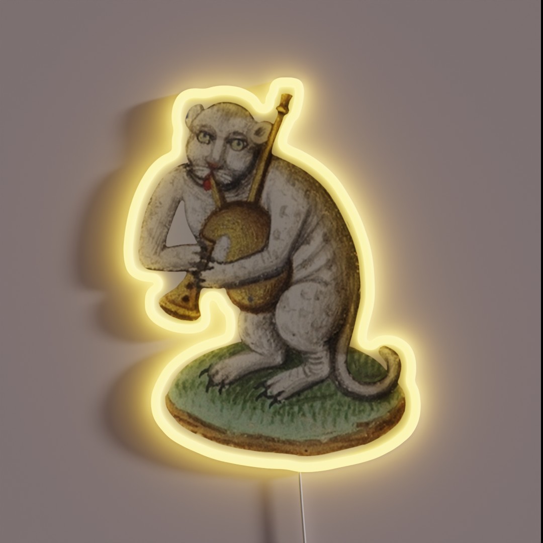 Step into the enchanting world of the Middle Ages with our Medieval White Cat Leopard Animal Creature Playing Music Neon Sign. This captivating piece of art combines medieval charm with modern technology to create an eye-catching addition to any room.