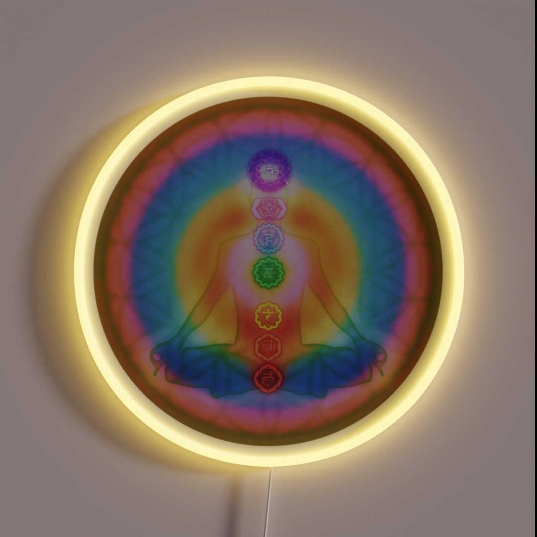 Bring balance to your space with Meditation and the Chakras III RGB neon sign, a vibrant tribute to spiritual growth and inner peace.