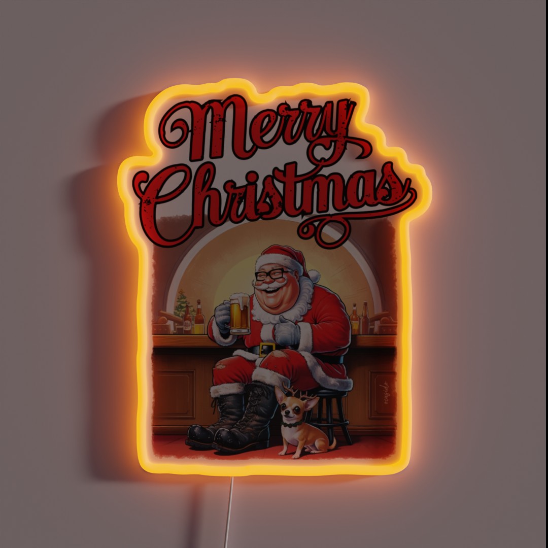 Holiday Cheer Neon Sign – Cheerful Santa Pours Beer with Chihuahua Reindeer, Vibrant RGB Lights