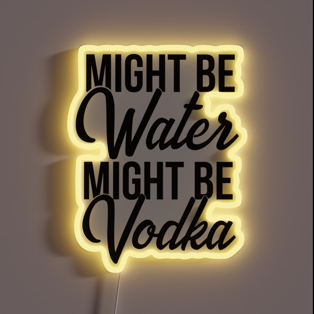 A quirky and eye-catching RGB neon sign that reads ‘Might Be Water Might Be Vodka’, perfect for adding a humorous touch to any home bar or entertainment space.