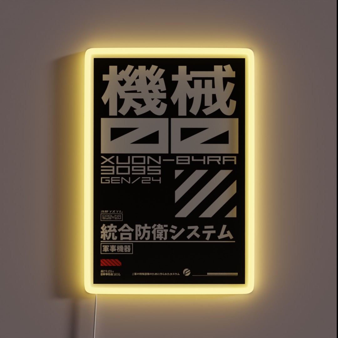 High-tech neon sign inspired by futuristic military technology, featuring vibrant 2-color RGB lights and a sleek Japanese-style design perfect for gaming rooms, man caves, or anyone who loves sci-fi action.