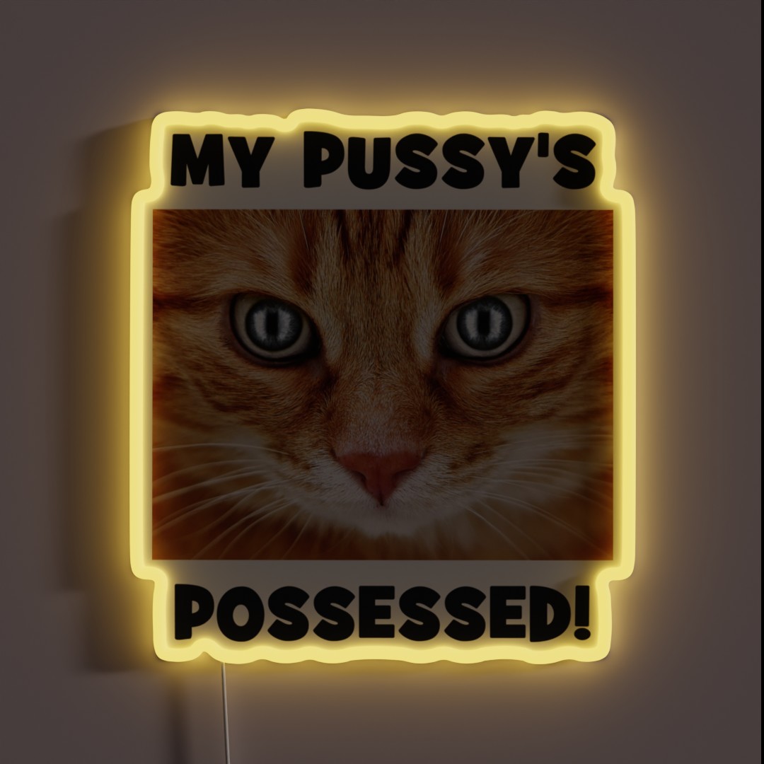 A unique and playful item! Here’s a concise, SEO-friendly description: “Add some cheeky charm to your space with this ‘My Pussy’s Possessed’ cat-themed RGB neon sign, a humorous double entendre that’s sure to spark conversations and delight cat lovers.