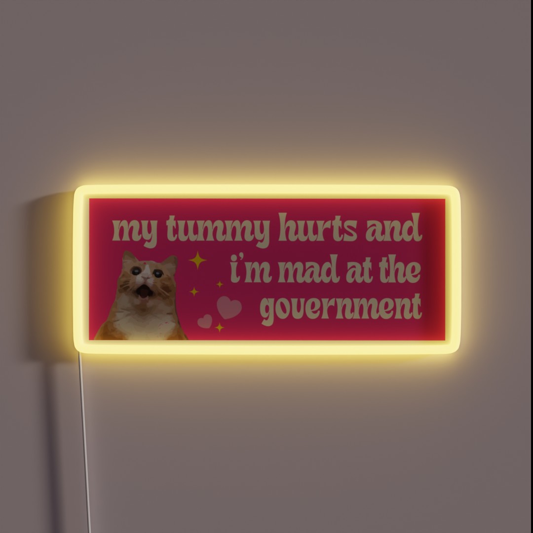 Express your frustration with the government in style with our ‘My Tummy Hurts’ neon sign, a humorous feline-themed twist on a classic protest phrase.