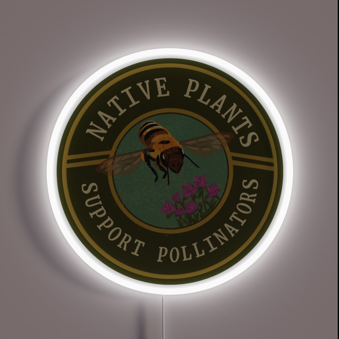 Support local wildlife with this vibrant RGB neon sign promoting the importance of native plants in pollinator conservation.