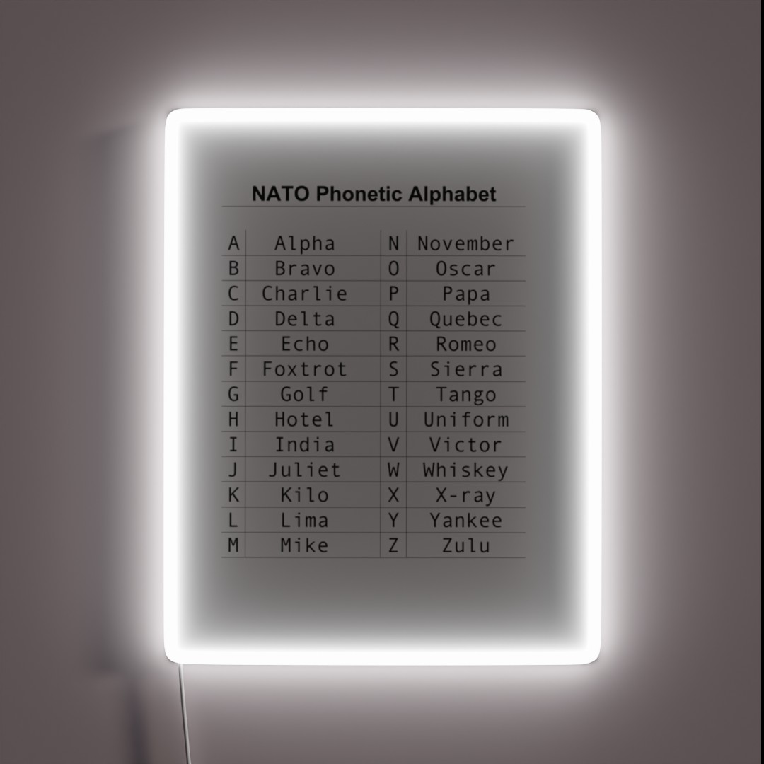 Bring the NATO Phonetic Alphabet’s distinctive letters and codes to life in vibrant colors that will captivate your friends and family. This unique sign is perfect for enthusiasts of coding, linguistics, or simply those who appreciate a touch of neon flair.