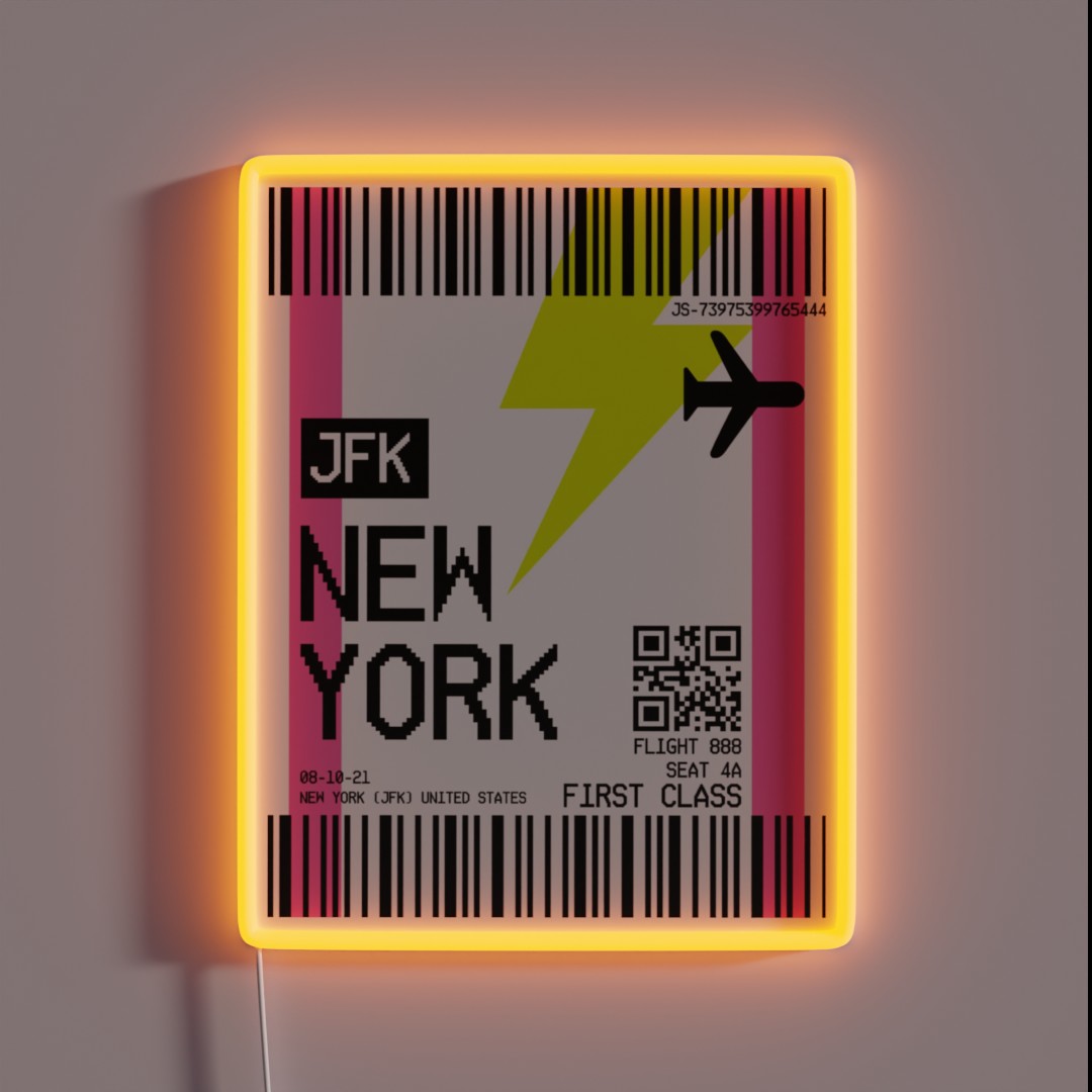 Illuminate your space with this vibrant New York-themed LED neon sign, featuring a stunning NYC plane ticket design in radiant RGB colors.
