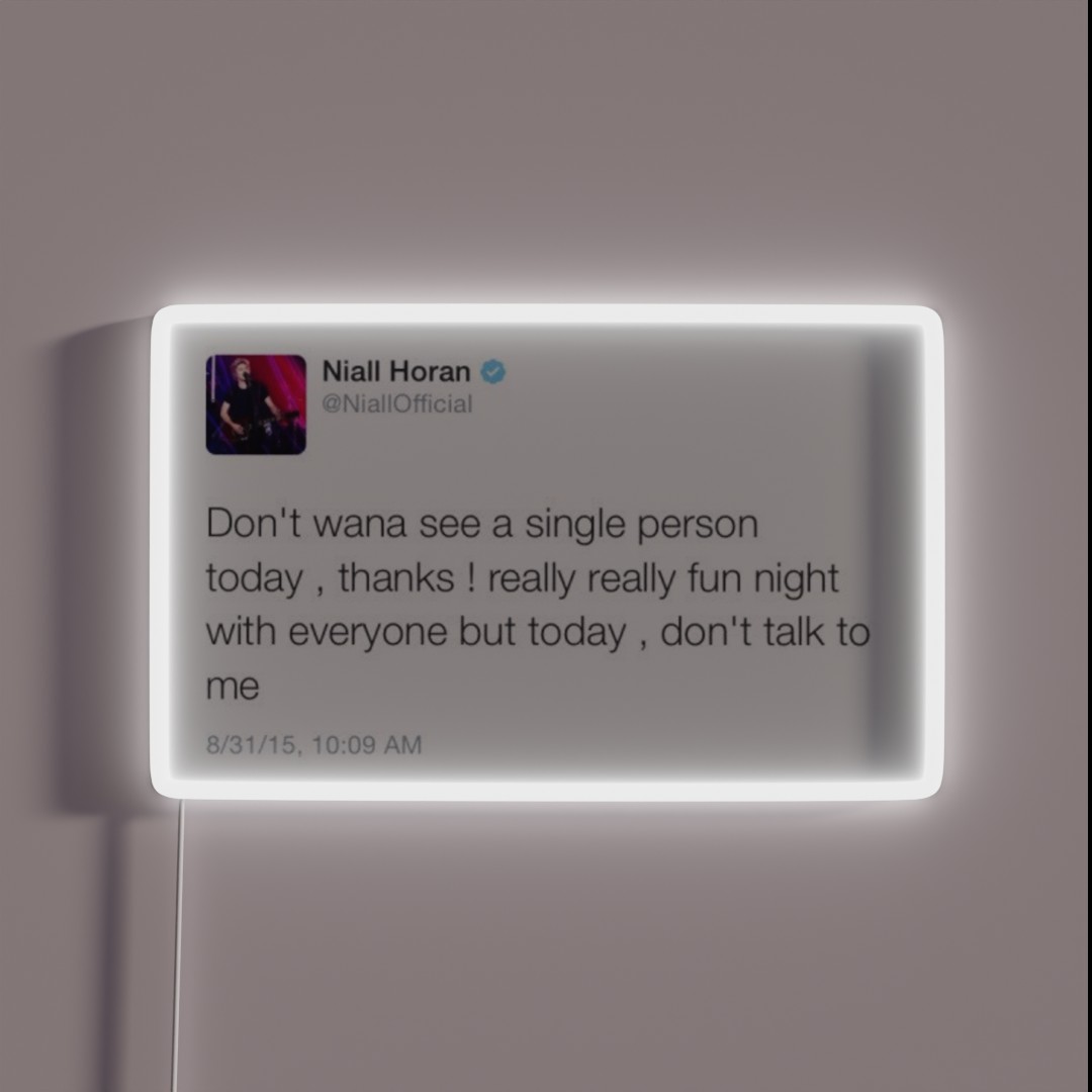 The Niall Don’t Talk To Me Tweet RGB Neon Sign is more than just a decorative item – it’s an investment piece that will add a unique touch to your space and provide years of enjoyment. Its sleek design and vibrant colors make it perfect for bedrooms, living rooms, or any area where you want to create a memorable atmosphere.