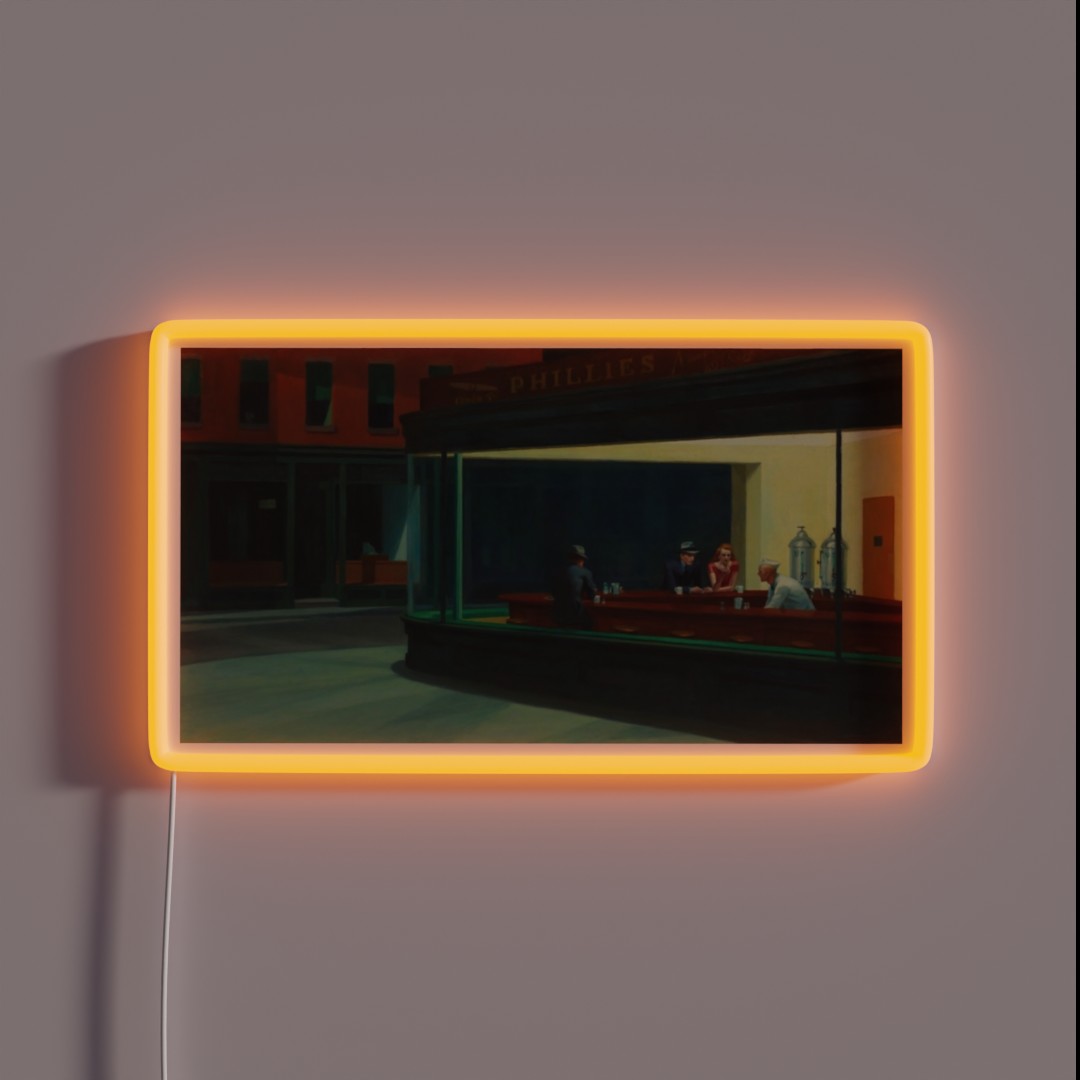 Pay homage to the iconic American artwork “Nighthawks” by Edward Hopper with our unique, touch-safe RGB neon sign. This innovative reproduction captures the essence of the classic painting while boasting cutting-edge technology.