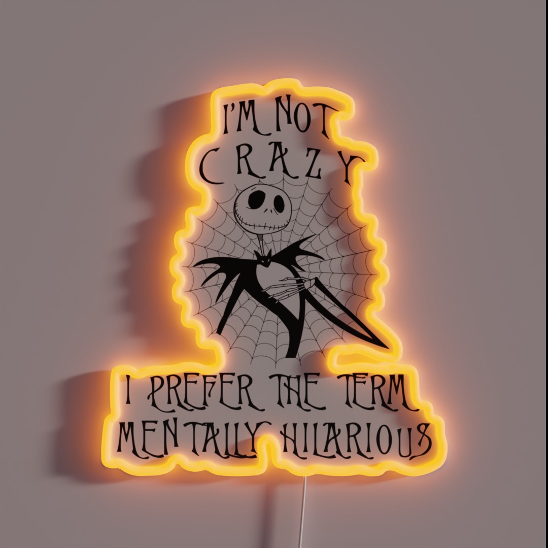 Add a touch of dark whimsy to your space with this Nightmare Before Christmas-inspired RGB neon sign featuring Jack Skellington’s signature phrase ‘I’m Not Crazy, I Prefer the Term Mentally Hilarious’ in bold, eye-catching letters.