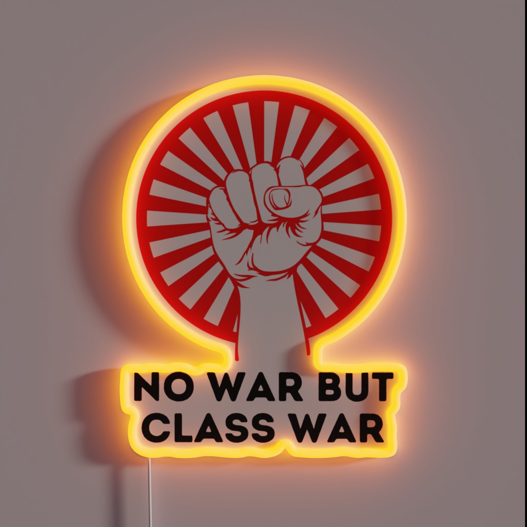 A bold, eye-catching RGB neon sign that reads ‘No War but Class War’ – a provocative statement against militarism and capitalism.