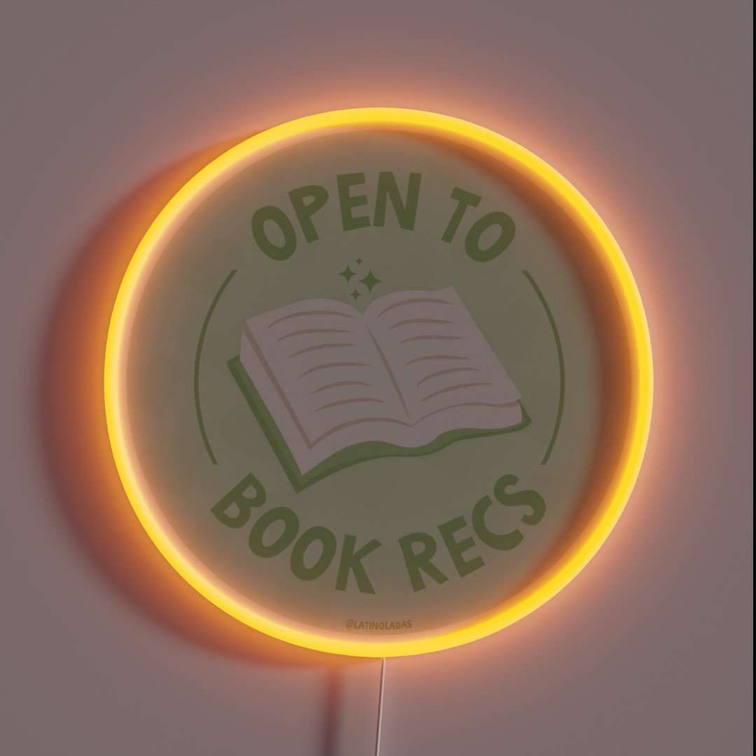 Neon book lover’s decor: vibrant pastel lime green ‘Open to Book Recs’ sign with heart design, perfect for Kindle readers and book enthusiasts.
