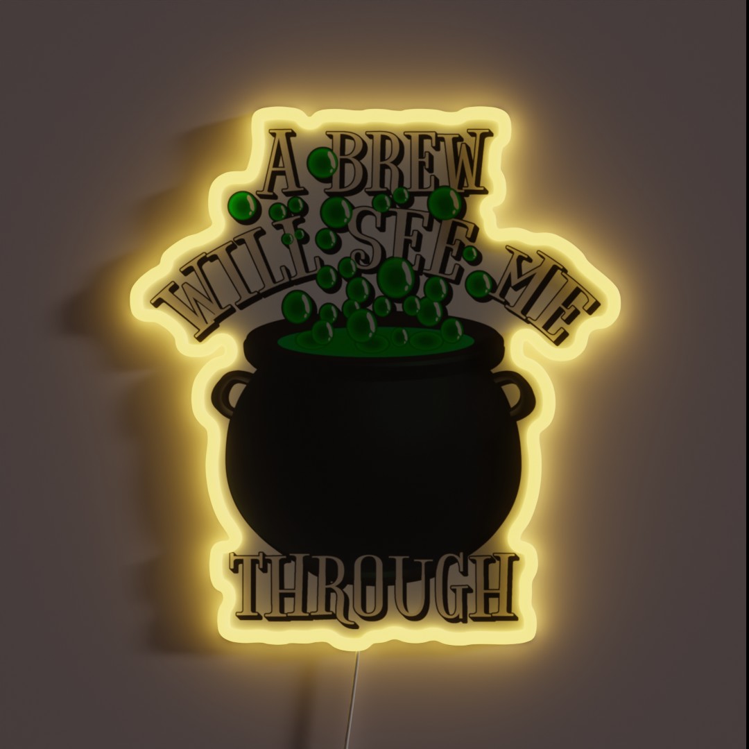 A vibrant, eye-catching RGB neon sign featuring an orange-themed design with a hauntingly cheerful phrase ‘A Brew Will See Me Through’ perfect for Halloween decorations.