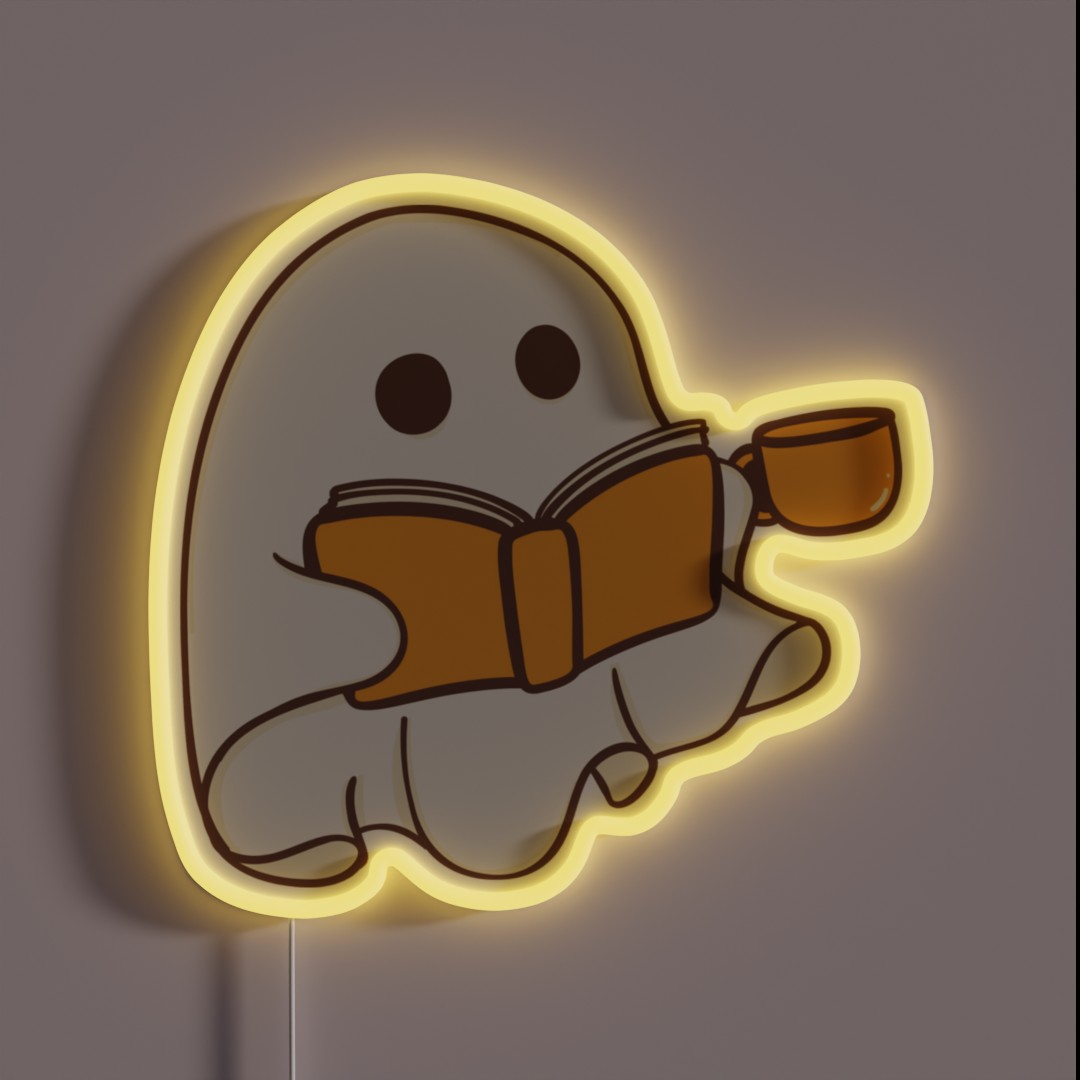 Add a touch of whimsy to your space with this unique Orange Sheet Ghost Neon Sign featuring a quirky character reading a book while sipping from a coffee mug in vibrant RGB colors.
