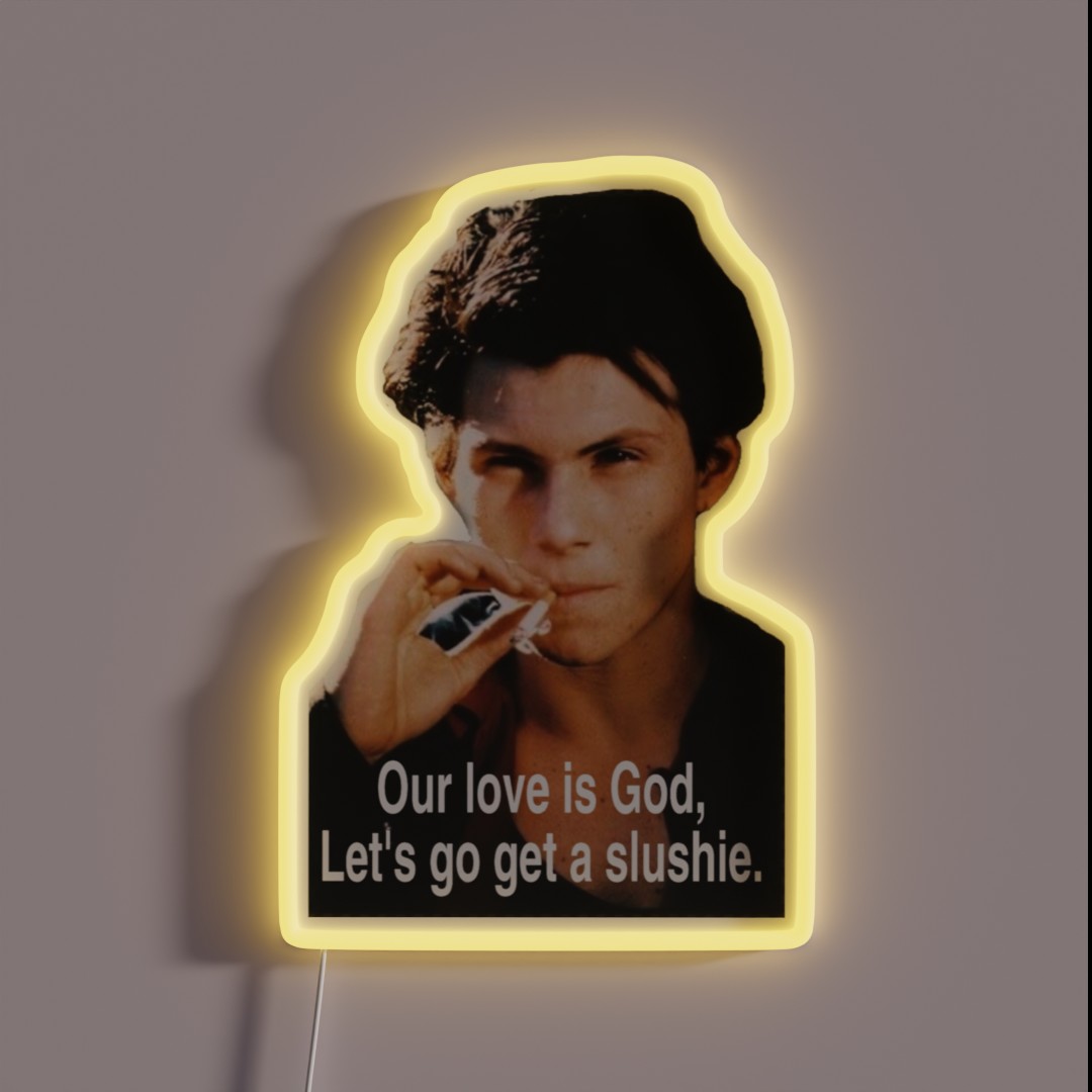 Unique Neon Sign – ‘Our Love Is God, Let’s Go Get a Slushie’ Vibrant RGB display adds a playful touch to any room.