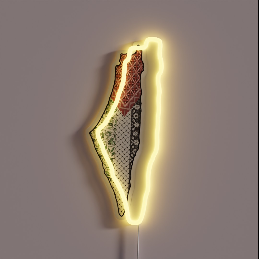 Add a touch of Middle Eastern culture to your space with this vibrant Palestine map neon sign featuring traditional keffiyeh and thobe patterns in bold RGB colors.
