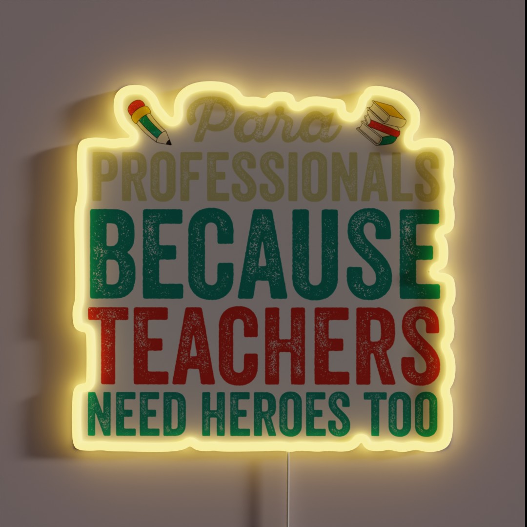 Boost school morale with our humorous paraprofessional gift, a bright and colorful ‘Paraprofessionals: Because Teachers Need Heroes Too’ RGB neon sign that shines appreciation for unsung heroes in the classroom.