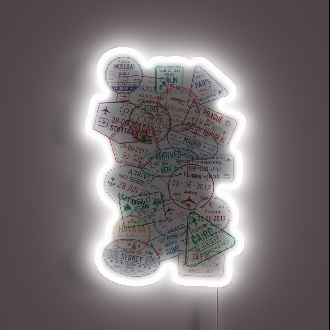 Add a pop of adventure to your travels with this vibrant Passport Travel Stamps Light RGB neon sign, featuring a stunning design that illuminates your favorite destinations in bright colors.