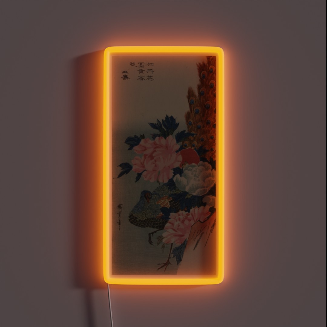Add a pop of vibrant culture to your space with this stunning Peacock and Peonies Japanese Woodblock Print RGB neon sign, blending traditional art with modern electroluminescent flair.