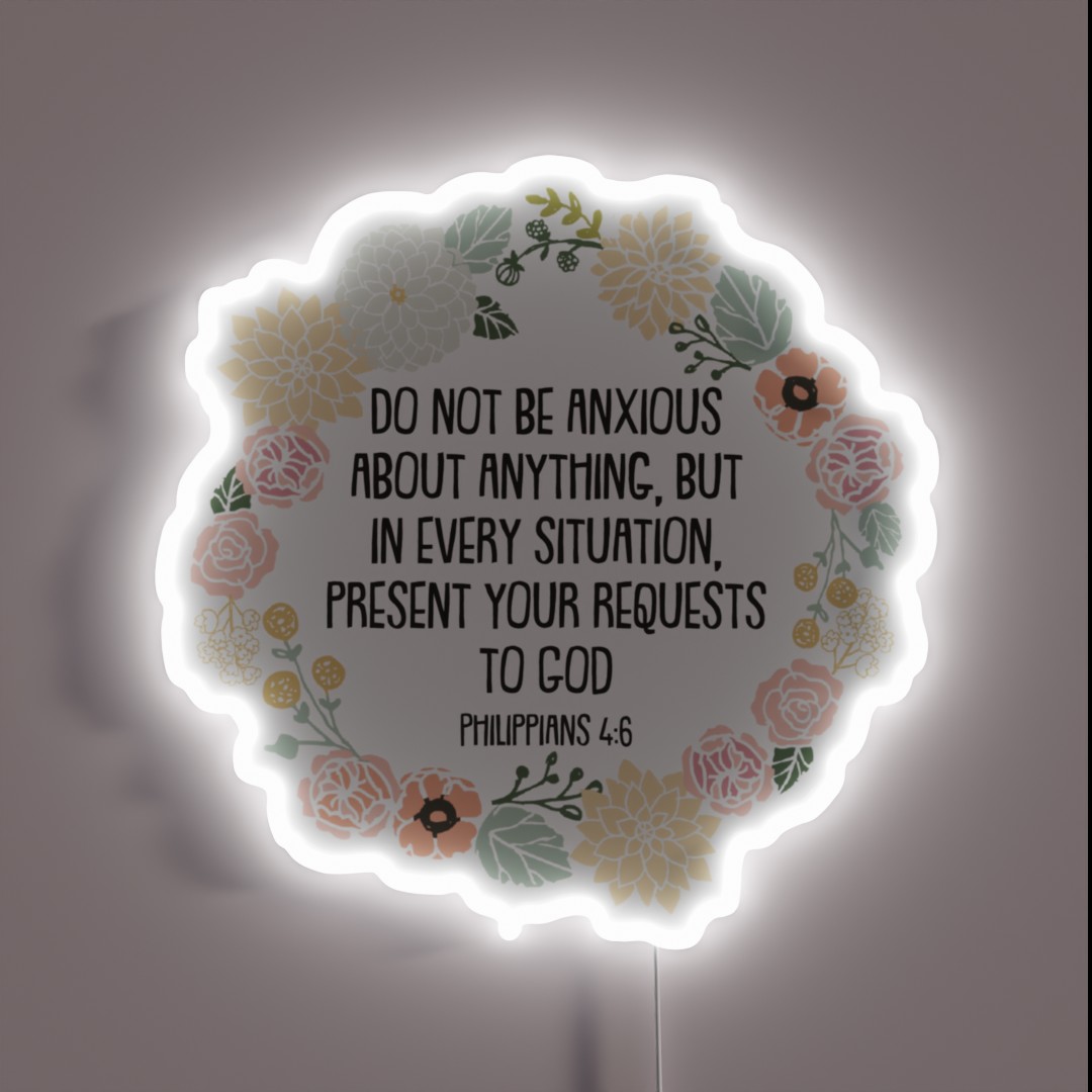 Bring a touch of divine inspiration into your home or office with our stunning Philippians 4:6 RGB neon sign. This beautiful piece of art is not only visually striking but also thoughtfully designed to promote positivity and peace.