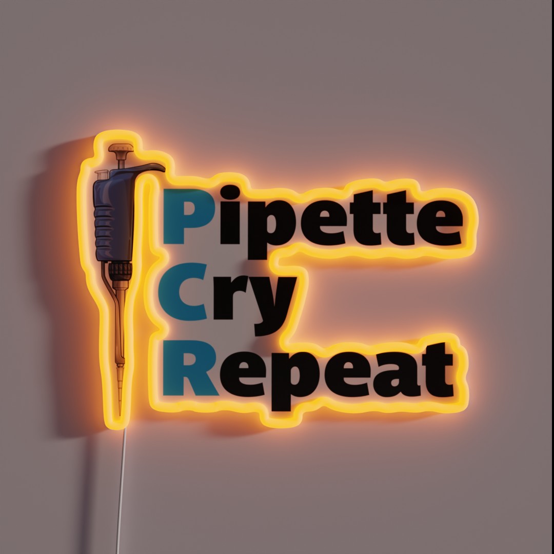 Add a pop of color and functionality to your lab with our customizable Pipette Cry Repeat PCR Blue Pipette RGB neon sign, perfect for highlighting pipettes in PCR workstations.