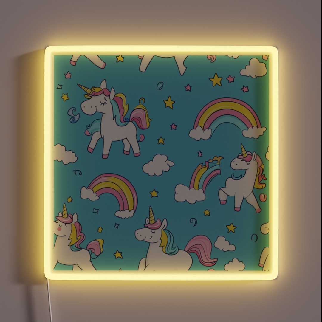 Introducing the Playful Unicorns seamless pattern RGB neon sign! This enchanting decoration brings a touch of magic to any room, with its vibrant and colorful design that will captivate both kids and adults alike.