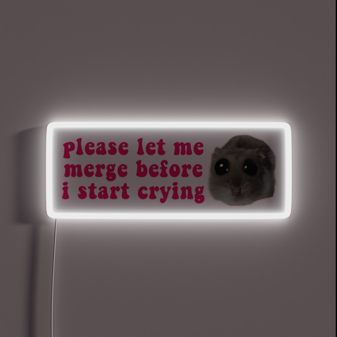 Get ready to smile every time you enter your room or office with our hilarious “Please Let Me Merge Before I Start Crying” RGB neon sign! This cute and quirky design features a funny hamster meme that’s sure to bring some levity into your life.
