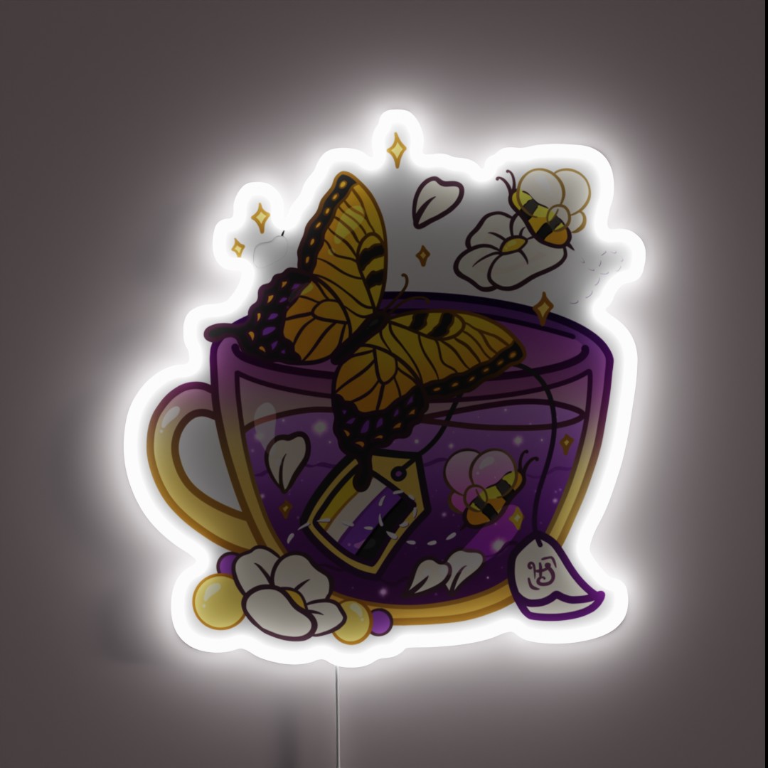 Showcase your non-binary pride with this vibrant Pride Flag Teacup Butterfly Neon Sign, blending colorful LGBTQ+ spirit with whimsical charm in a unique RGB display.