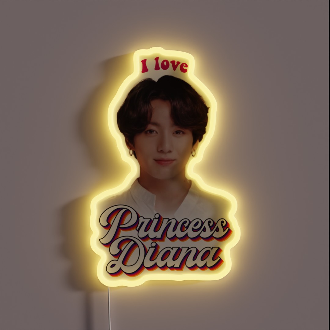 Brighten up your space with our vibrant Princess Diana Jungkook K-pop retro meme RGB neon sign, featuring a mesmerizing fusion of nostalgia and Korean pop culture.