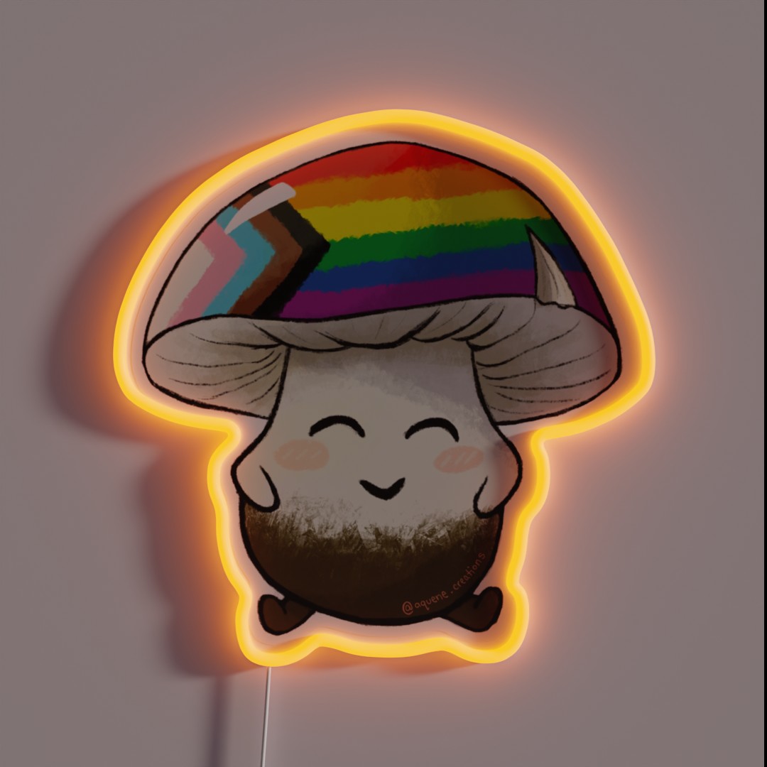 Showcase your LGBTQ+ pride with our vibrant Progress Pride Mushroom RGB neon sign, featuring a colorful and inclusive design that shines bright in any room.