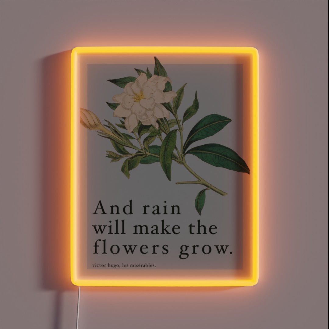 Bring the iconic optimism of Les Misรฉrables to your space with this unique RGB neon sign featuring Jean Valjean’s poignant phrase ‘Rain will make the flowers grow’ in a stunning, eye-catching display.
