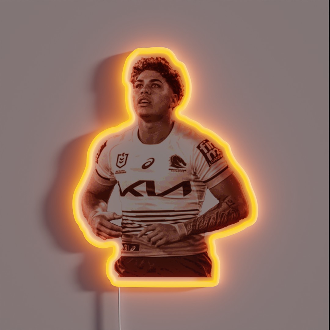 Add a vibrant touch to your space with this unique Reece Walsh hot orange posterised RGB neon sign, perfect for Brisbane Broncos fans and football enthusiasts alike.