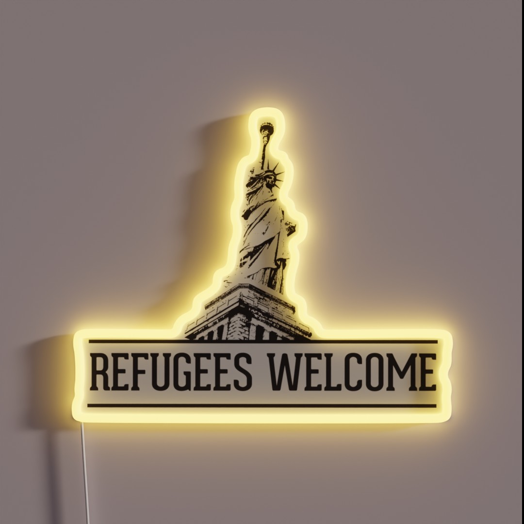 Welcome refugees with pride and inclusivity. This vibrant, energy-efficient RGB neon sign adds a touch of warmth to any space, promoting empathy and understanding.