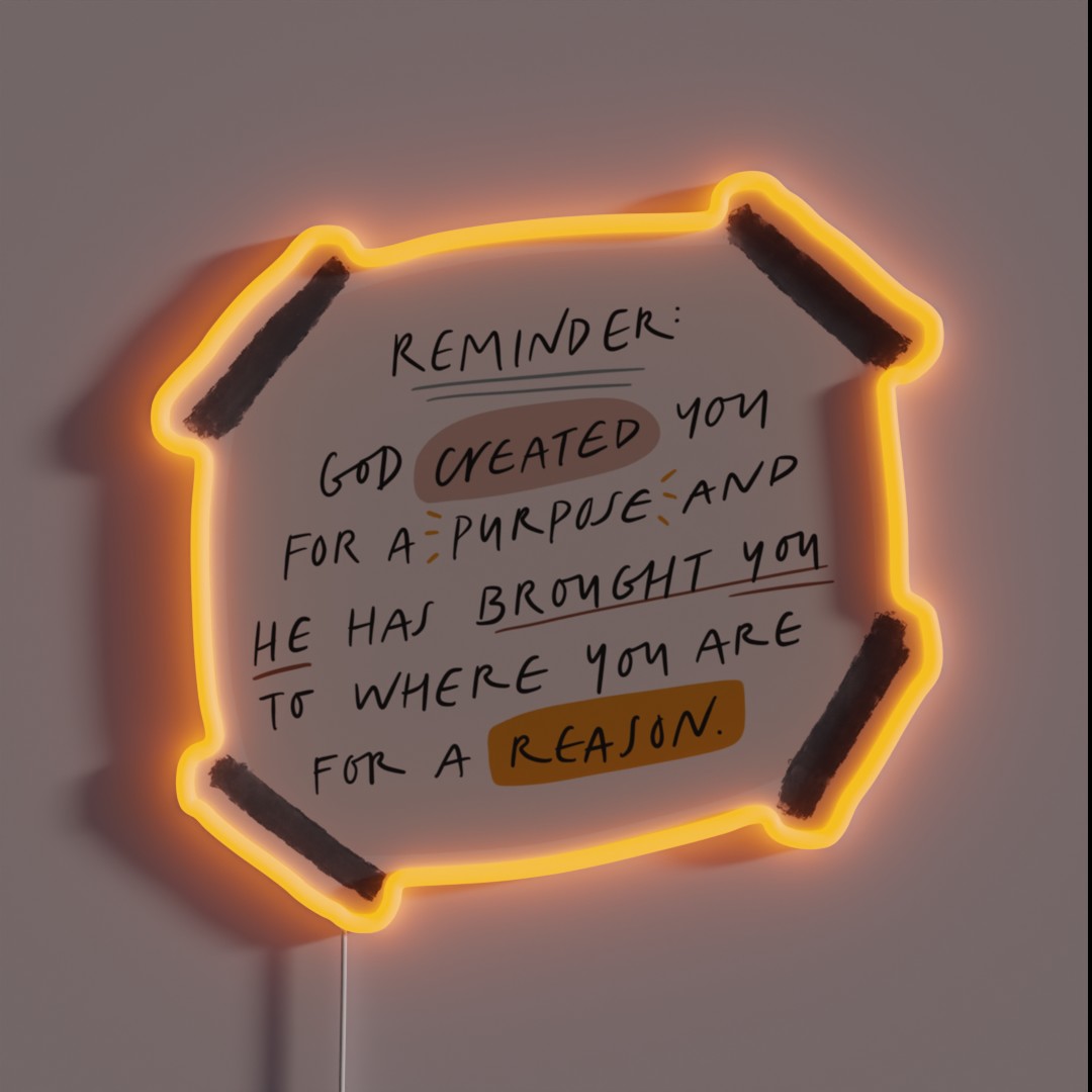Boost your motivation and self-confidence with this vibrant Reminder God Created You For A Purpose RGB Neon Sign, serving as a daily affirmation to stay focused on your goals and dreams.