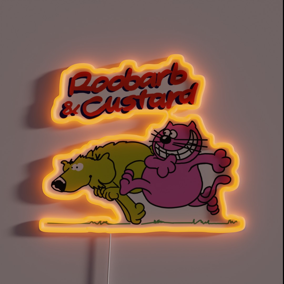 A vibrant, handcrafted RGB neon sign featuring iconic characters Roobarb and Custard from the beloved British children’s series ‘Roobarb & Custard’. Perfect for fans of nostalgia and quirky decor.