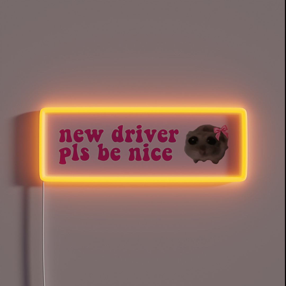 Add a dash of quirky humor to your space with this unique Sad Hamster New Driver Pls Be Nice RGB neon sign, featuring colorful, eye-catching lighting and a relatable message for any new driver.