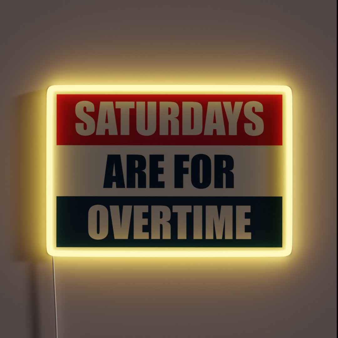 Introducing the Saturdays are for overtime RGB neon sign – a vibrant and eye-catching addition to any room or office space. This stunning sign not only serves as a functional decoration but also as a bold statement piece that expresses your personality.
