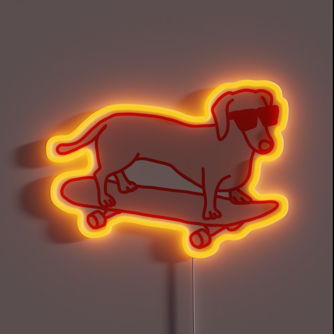 Add a playful touch to your space with our vibrant Sausage Dog on a Skateboard RGB neon sign, perfect for dog lovers and fans of quirky decor.