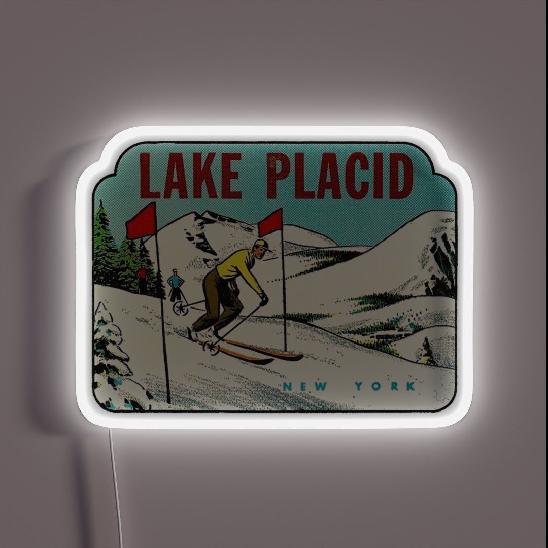 Add a touch of retro charm to your home or office with this vintage travel decal featuring a nostalgic image of Ski Lake Placid, New York, illuminated by vibrant RGB neon lights.