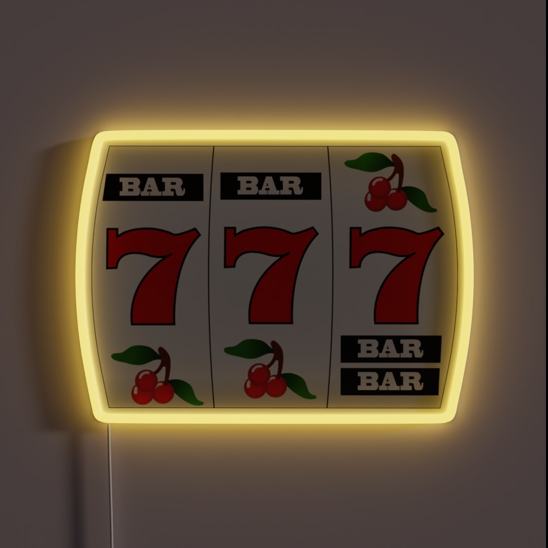 Glowing slot machine-inspired neon sign with RGB color-changing capabilities, adding a touch of retro casino flair to any gaming room or entertainment space.