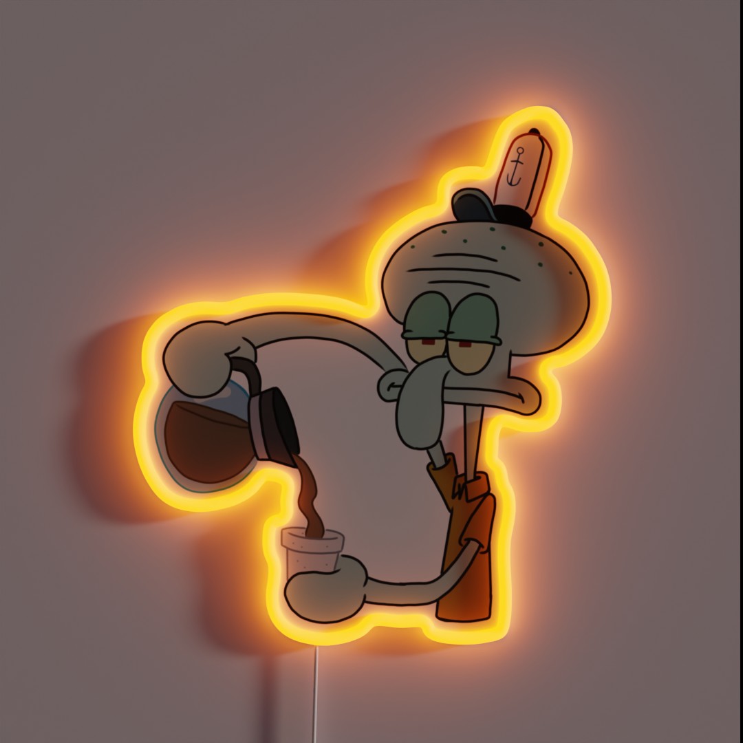 Add some Bikini Bottom flair to your space with this unique Squidward and coffee-themed RGB neon sign, featuring the grumpy octopus in a humorous morning moment.