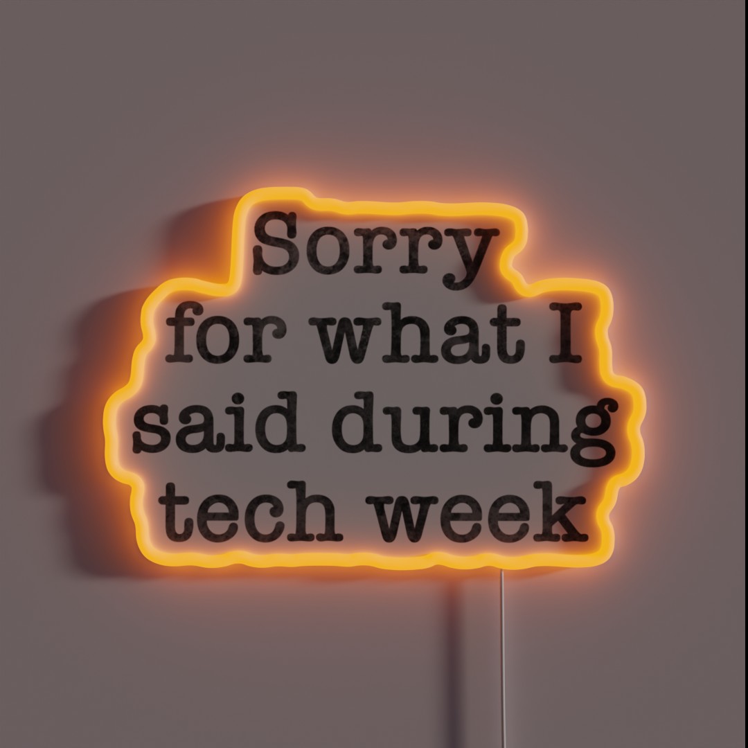 Add a touch of geek chic to your workspace with the Tech Week Apologies RGB neon sign, a humorous reminder that even tech pros make mistakes.