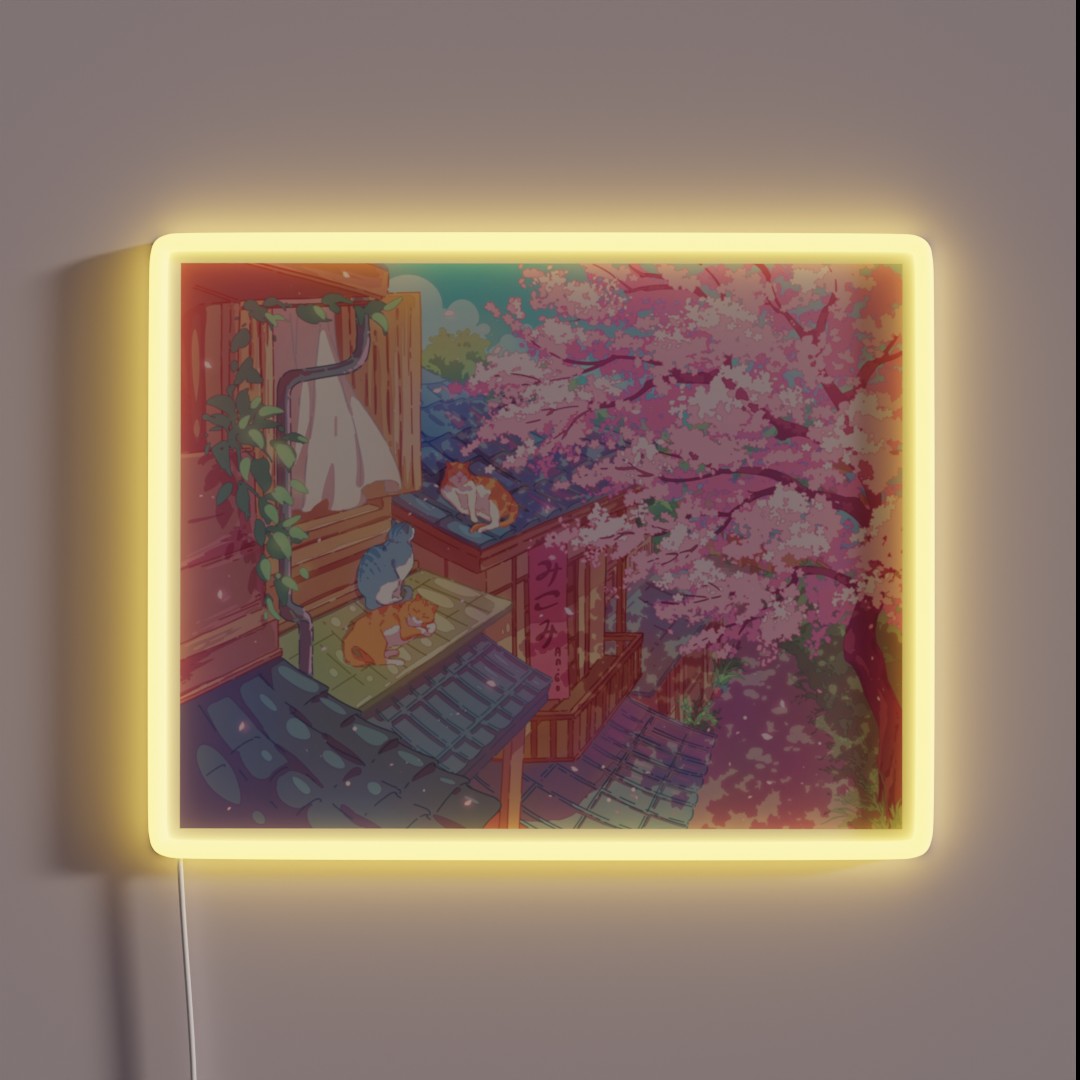 The Cute Cats Rooftops And Pink Cherry Blossom RGB Neon Sign
