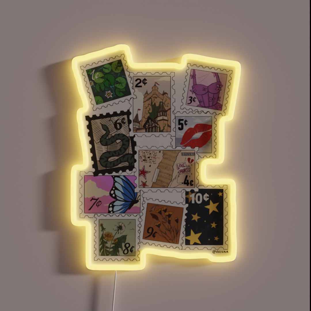 Illuminate your space with vibrant personality using this Eras Travel Stamps RGB neon sign, featuring colorful, hand-painted-style art and customizable color options.