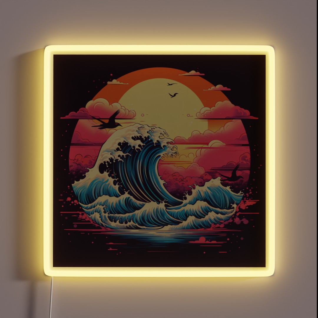 Whether you’re looking to add some Japanese flair to your decor or simply want a stunning light installation, this sign is sure to impress. Order now and experience the magic of The Great Retro Wave Japanese Ravens Sunset RGB neon sign!